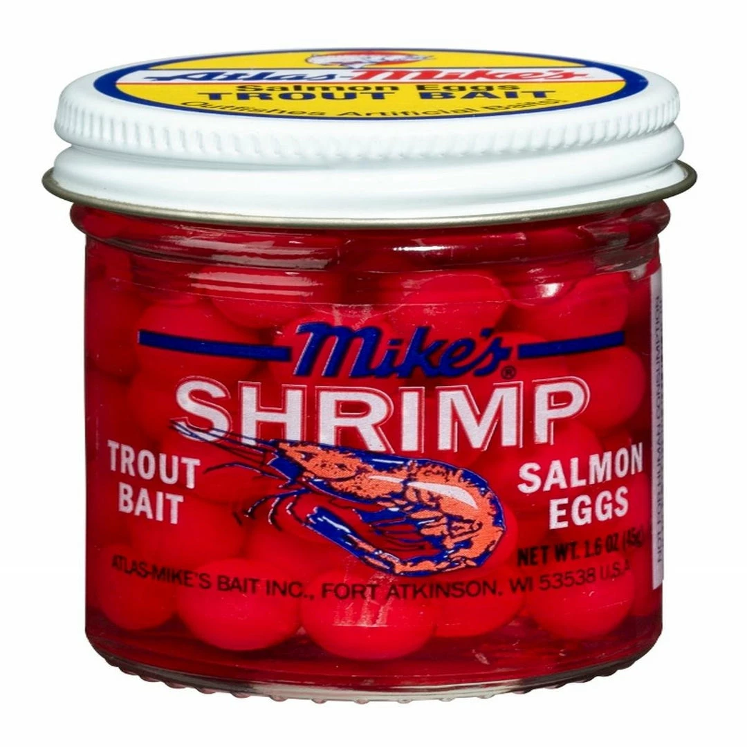 - Mike’s Shrimp Eggs are shrimp flavored salmon eggs.