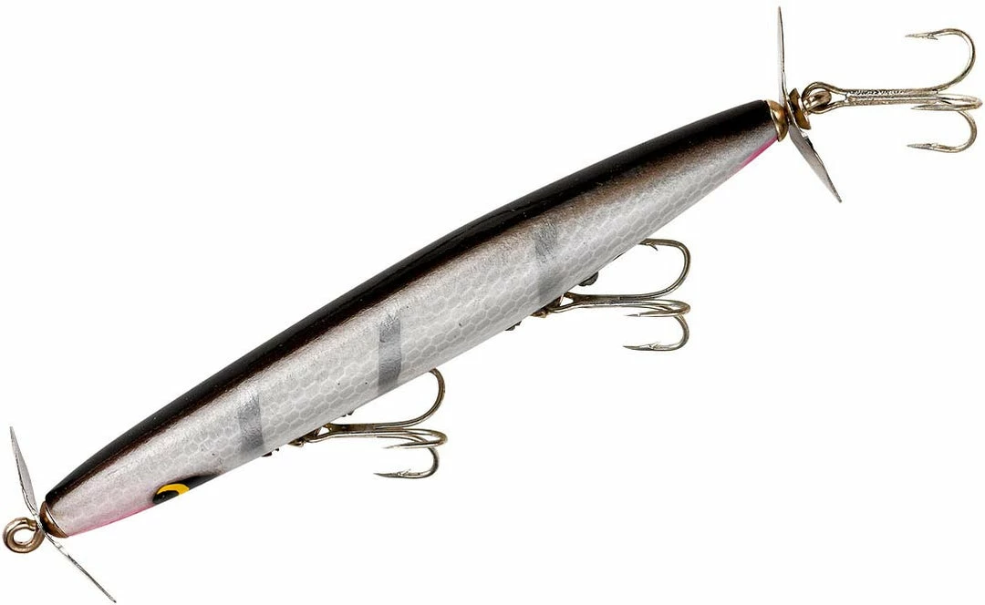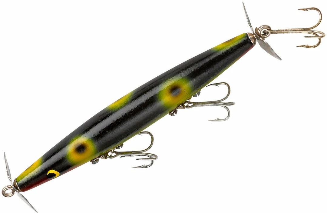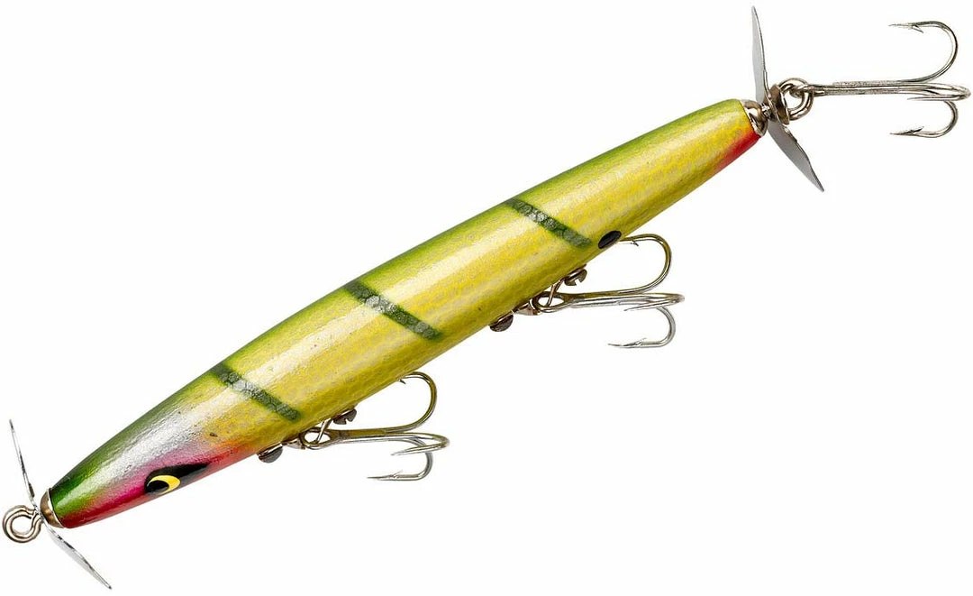 The Smithwick Devil’s Horse Twin Prop Topwater Lure is a 4 1/2 inch, 3/8 ounce thin body twin prop topwater lure. It is a classic handcrafted wooden bass fishing lure. The propellers at the front and tail of the lure can be adjusted to throw more water and work slower, or bent back for a quicker, quieter retrieve.Â
