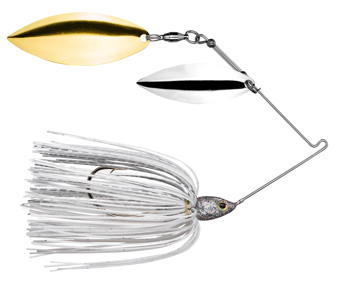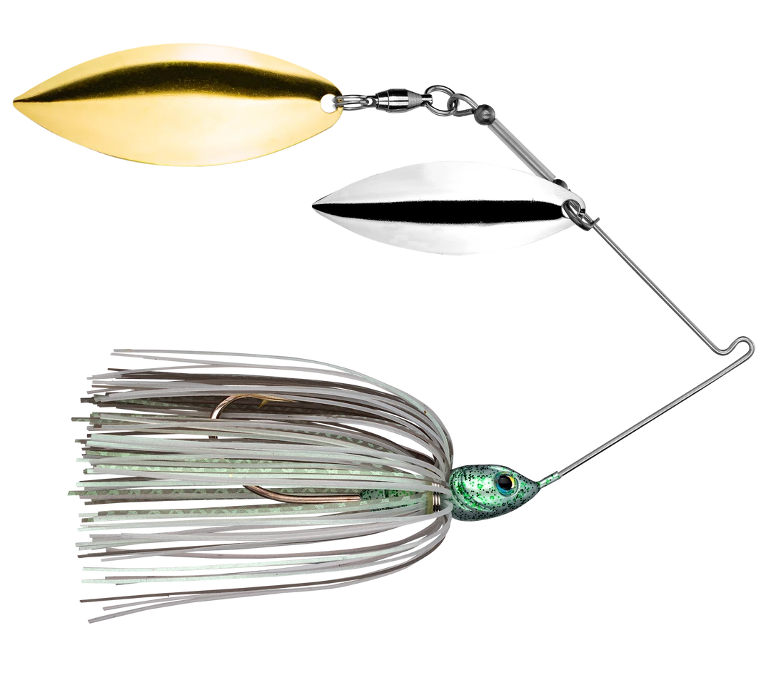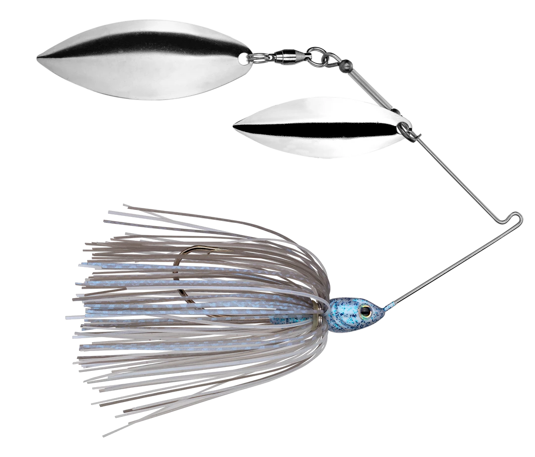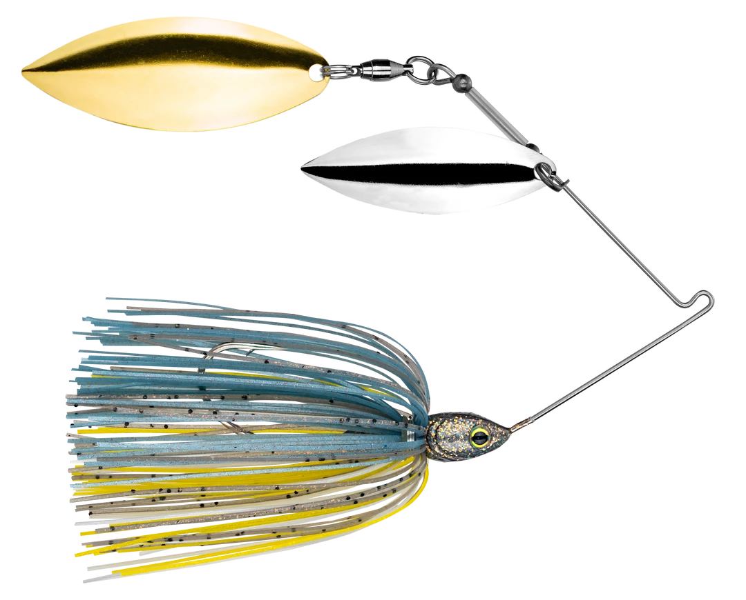 The Strike King Tour Grade Double Willow Spinnerbait is the newest member of Strike King’s wire bass fishing spinnerbaits. It uses a brand new super-sleek head design that cuts through water and vegetative cover like a knife while simultaneously keeping the lure balanced and running true. The head design also features 3D eyes and molded gill plates for added realism.