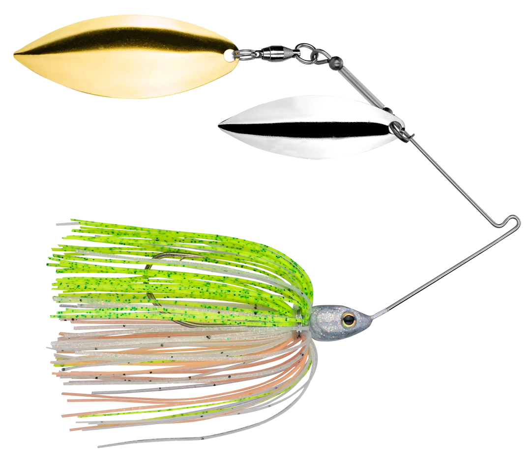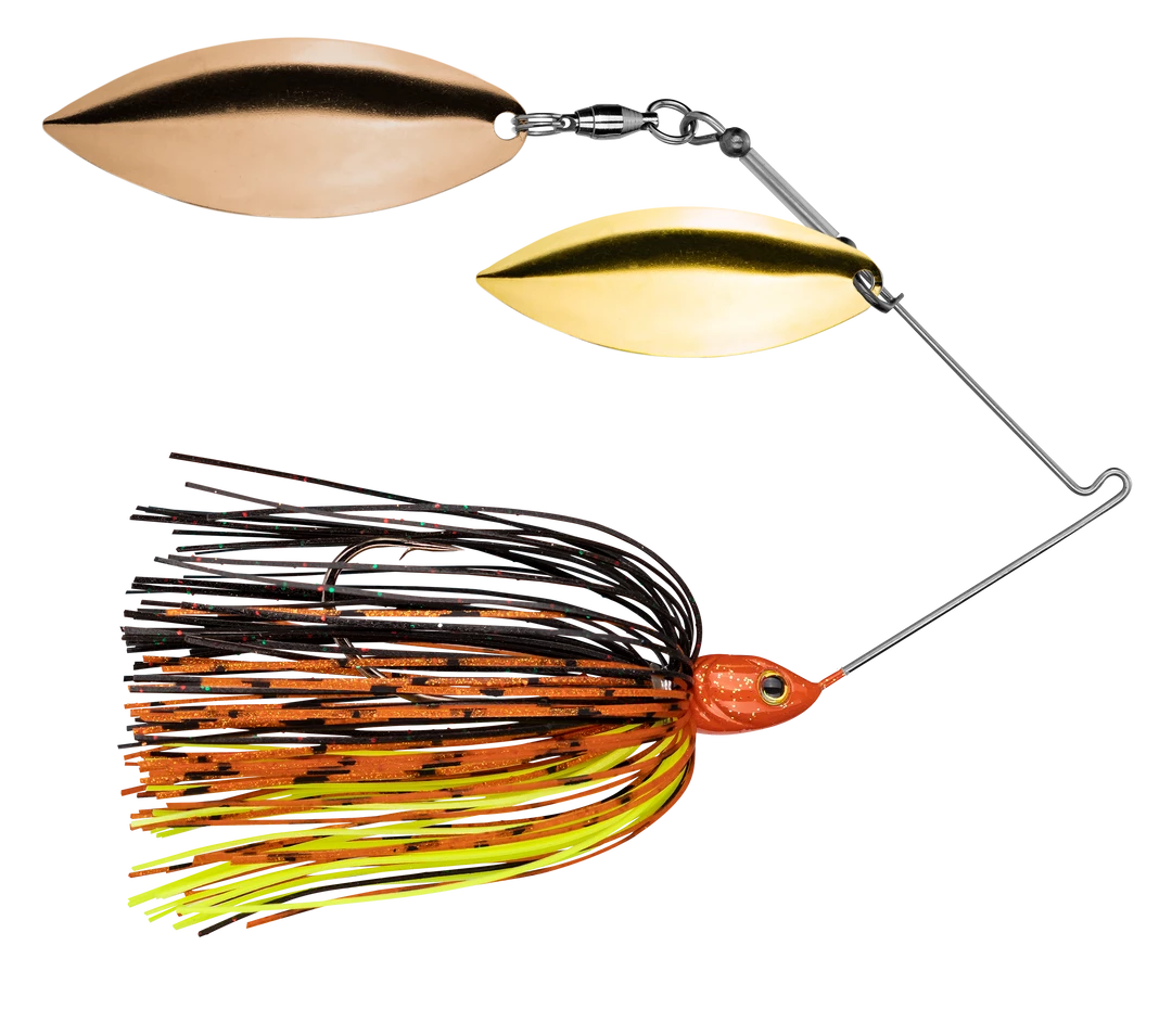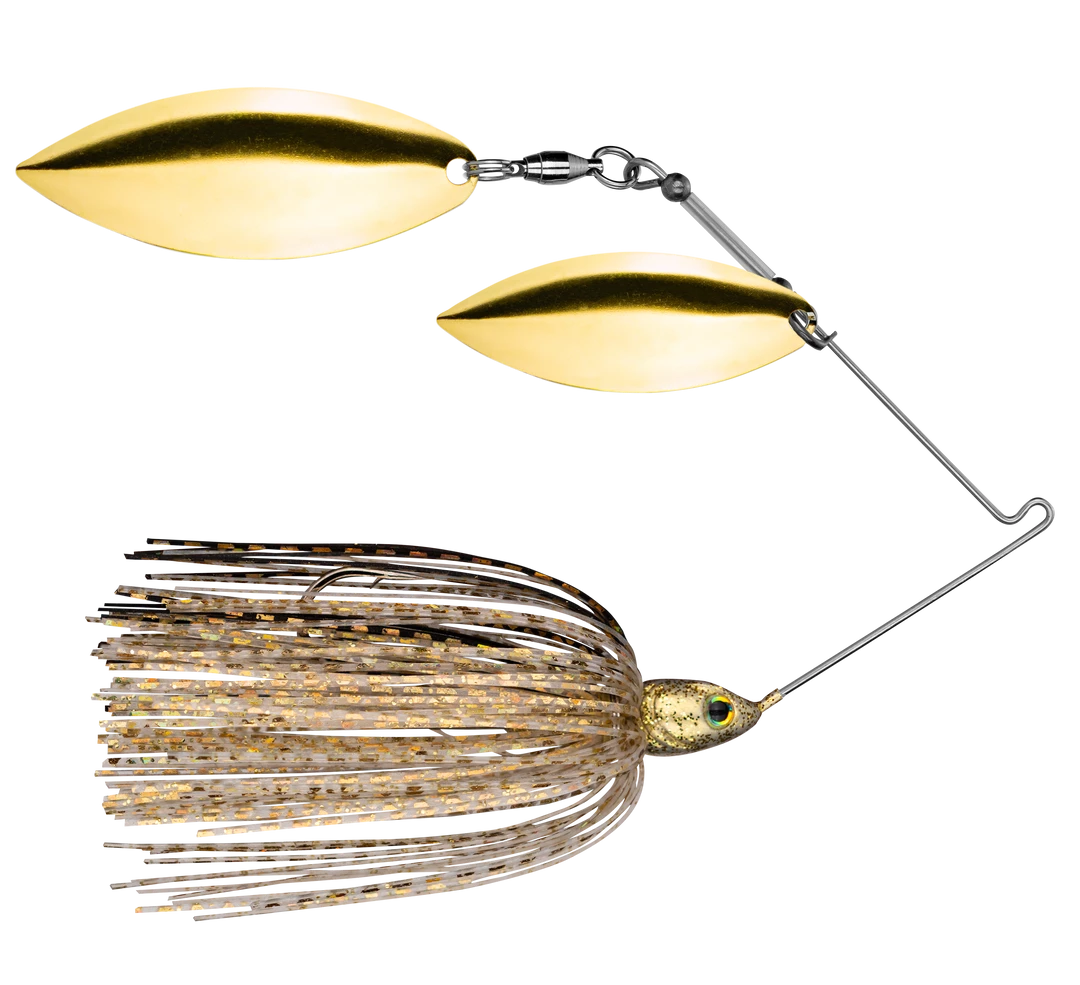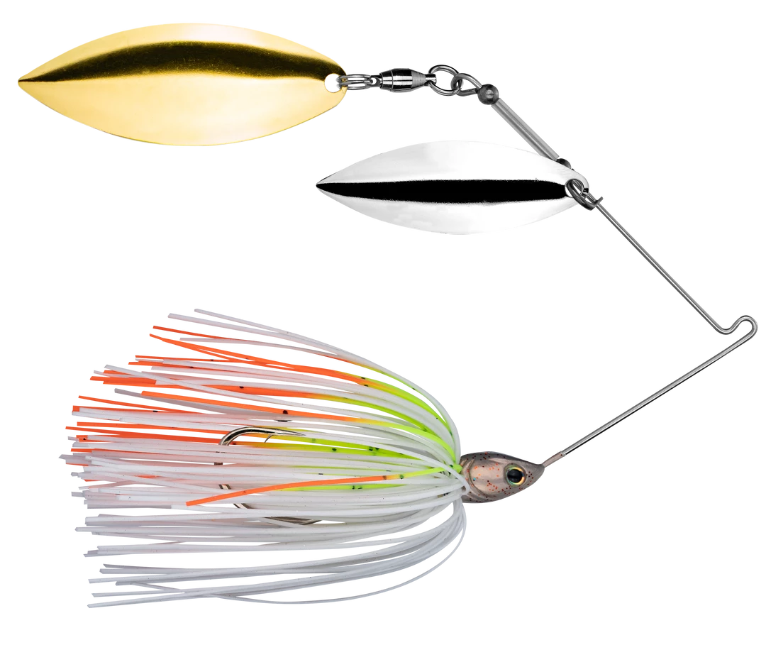 The Strike King Tour Grade Double Willow Spinnerbait is the newest member of Strike King’s wire bass fishing spinnerbaits. It uses a brand new super-sleek head design that cuts through water and vegetative cover like a knife while simultaneously keeping the lure balanced and running true. The head design also features 3D eyes and molded gill plates for added realism.