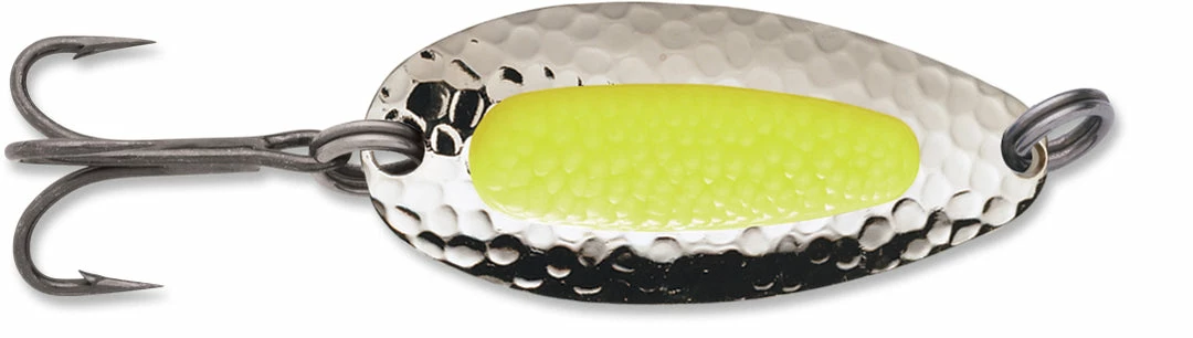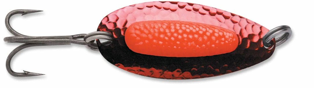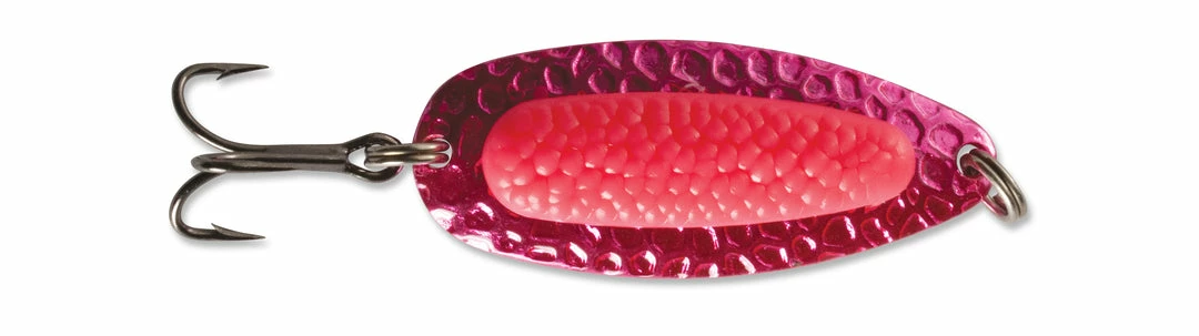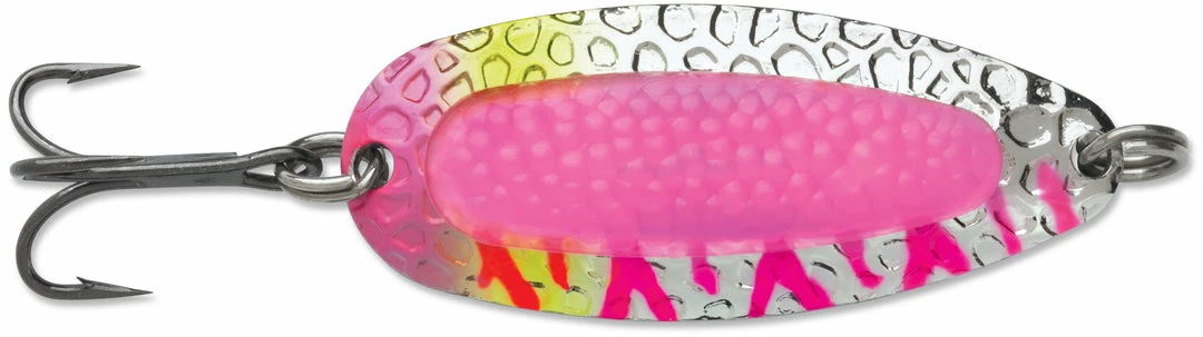 Blue Fox Pixee Spoon features heavy-duty construction that allows long casts and deep retrieves even in fast moving water. It really lures ’em in with a dazzaling sparkle of flashes emitted from the hammered spoon. A plastic insert designed to add a natural touch by imitating a cluster of fish eggs. Rigged with extremely sharp VMC black nickel treble hooks for excellent penetration and flawless hooksets. Includes a properly sized siwash hook as well. Available in a wide range of colors, you can choose from UV, nickel plated, gold plated, painted and metallic finishes.