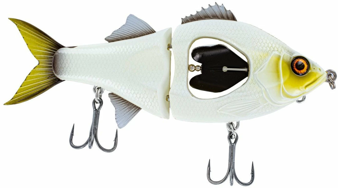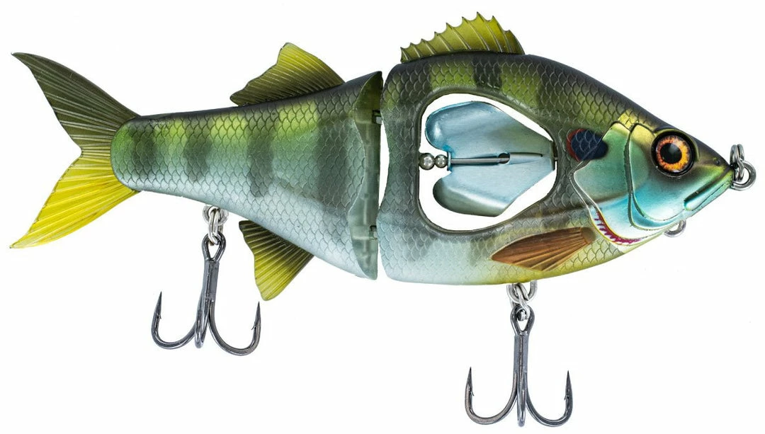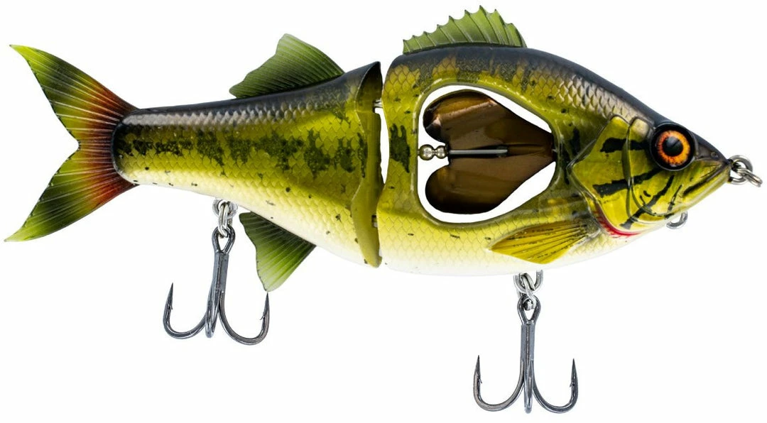 The Chasebaits PropDuster Glider is an innovative, new glidebait-style hard body swimbait with a propellor blade similar to the kind you would find on a buzzbait in the center of its body. Not only does this buzz blade make the bait look alive, it generates tons of water vibration and provides a distinct contrast and flash. Upon retrieve, the lure’s single joint construction produces a 180-degree side-to-side glide bait swimming action that consistently draws savage reaction strikes from predators.