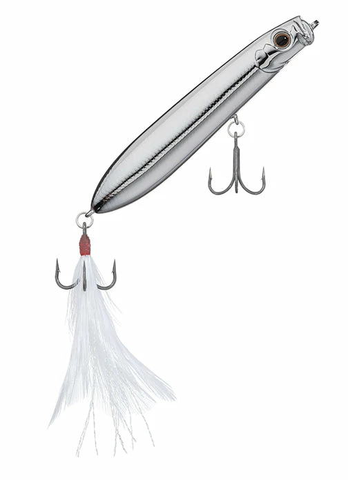 The SB-77 has the same water-chugging cupped mouth, irresistible walk-the-dog action, and tungsten weight long cast/rattle system as the larger sizes too. The SB-77 is pre-rigged with a size 6 treble in front and size 7 feather-dressed treble in rear.