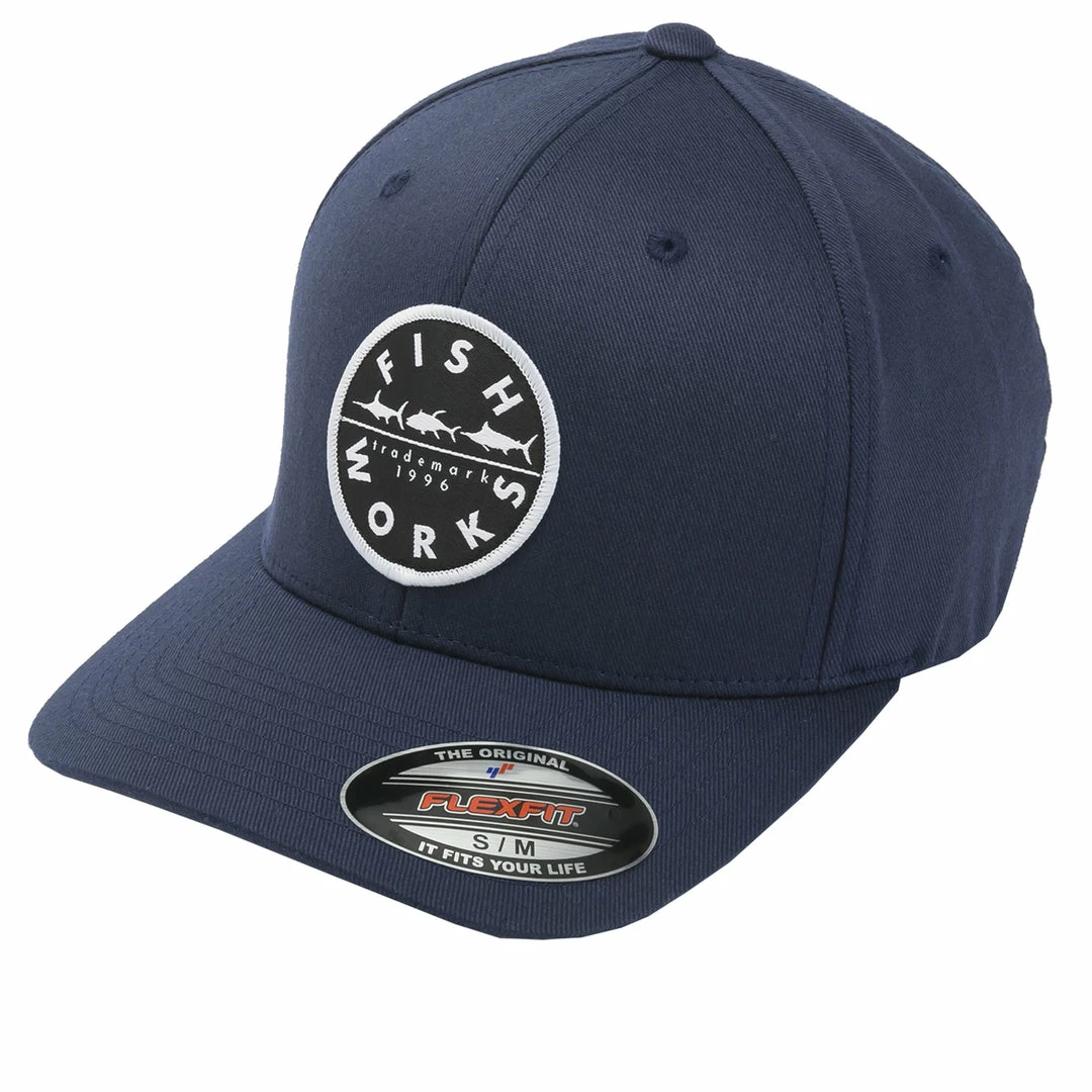 - The Fishworks Flexfit Fitted Fishing Hat is a fitted ballcap in Navy Blue with a Fishworks patch on the front.