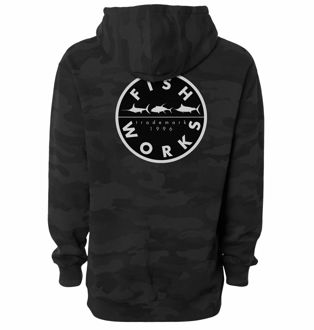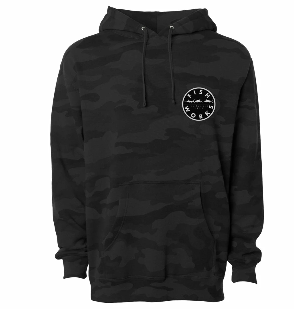 - The Fishworks New Original Hooded Fleece is a black camo hoodie featuring the Fishworks New Original Logo on the back.