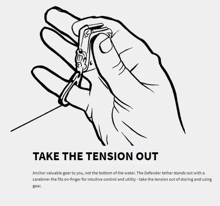 Both the large and compact Defender tethers were designed with control in mind, anchored by the tip control carabiner that both versions boast. This carabiner slips on finger to absorb the tension of the line and allow for ease of use when operating the tethered tool.