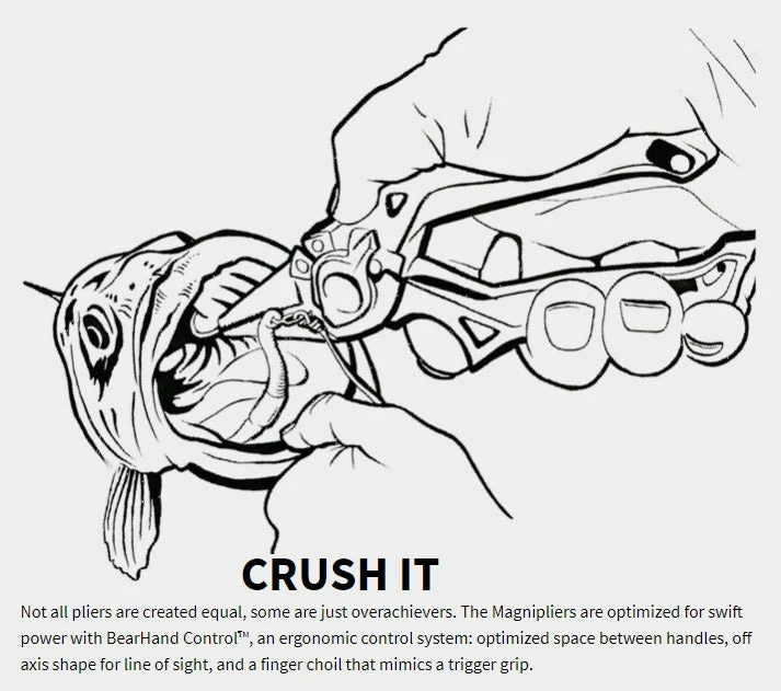 - The Magnipliers are all about control. Featuring a finger choil for confort and manageability, an angled shape off-axis, and optimized space between the handles, these pliers let you get into hard-to-reach places to free more deeply hooked lures.