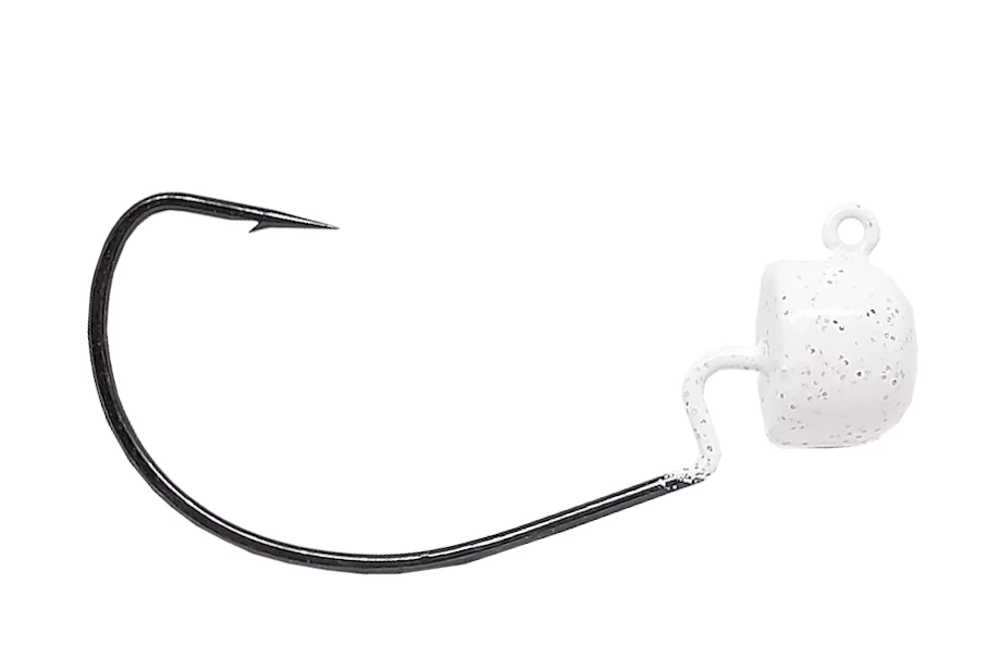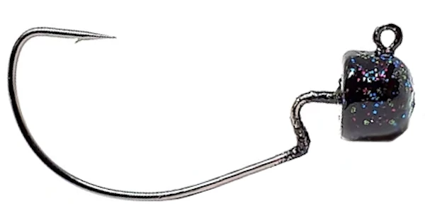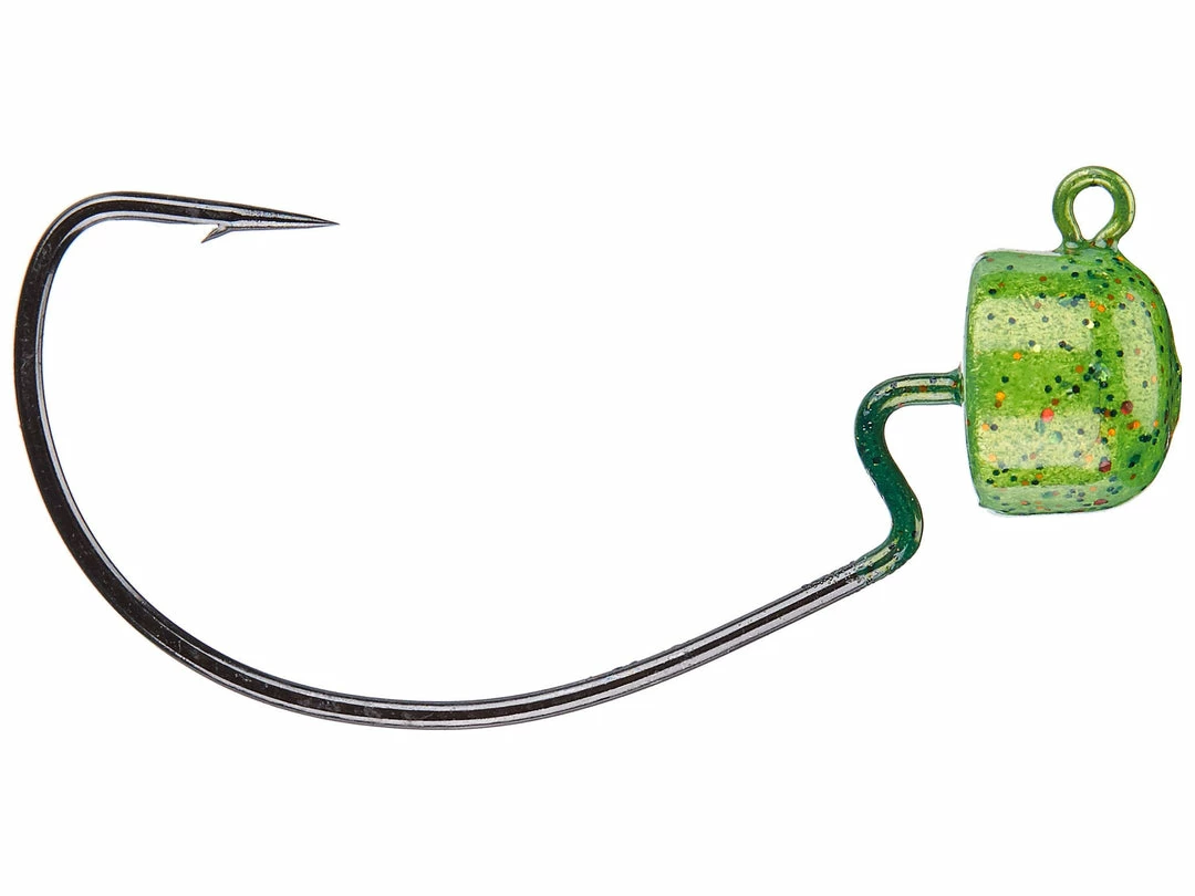 - Lead mushroom-shaped head molded around a 1/0 VMC 90 degree EWG jig hook.