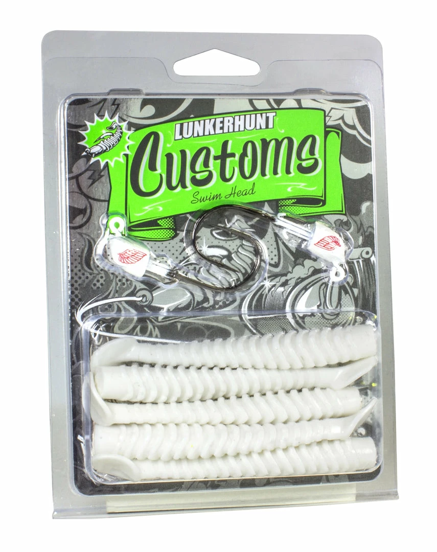 The Lunkerhunt Swim Combo is a 3 1/2 inch paddle tail swimbait and 1/4 ounce swimbait jighead combo (4 inches when put together) featuring Lunkerhunt Custom Swim Heads and Swim Fish. Both the swimbaits and heads have been uniquely engineered and paired together to cover the entire water column in an efficient manner.
