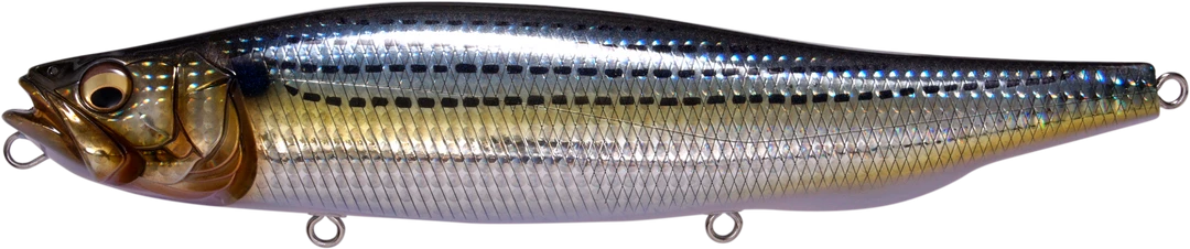 The Megabass Megadog is more than just an 8.6 inch, 4.6 ounce topwater walking bait, it is a weapon designed to target both trophy largemouth bass, as well as other surface feeding big game such a musky, striper, tuna, GT, and more. By pushing the potential of the Megabass walking masterpiece, the DOG-X, to the limit, Megadog deploys intense flashing appeal and surface disturbance to target large bass that are keyed in on big baitfish boiling on the surface. Despite its large frame, the Megadog features very low pulling resistance. Its ability to perform the sliding motion of a frantically escaping baitfish with simple reel-stop retrieves reduces the energy expenditure required to work this bait. Of course, Megadog can also be worked aggressively with sharp rod-action for mega-boiling action. This supersized walking bait will let you fully experience the excitement of big bait topwater games.