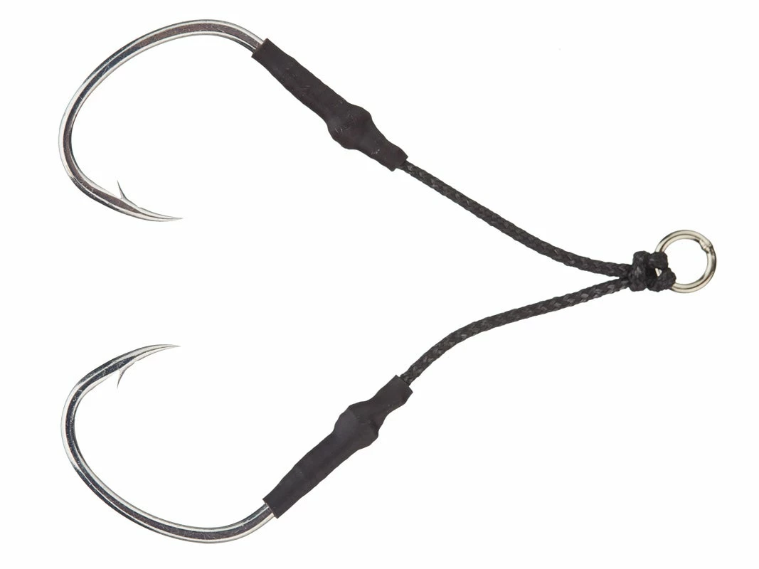 The Nichols Decoy Magnum Assist Hook is a set of 3/0 Decoy stinger assist hooks designed for the Nichols Ben Parker Magnum Flutter Spoon and Super Magnum Flutter Spoon. The hooks come attached to heavy-duty cord with shrink tubing, the cord is then tied to a split ring that can be attached on the opposite end of the spoon as where the pre-rigged treble hook is found.Â