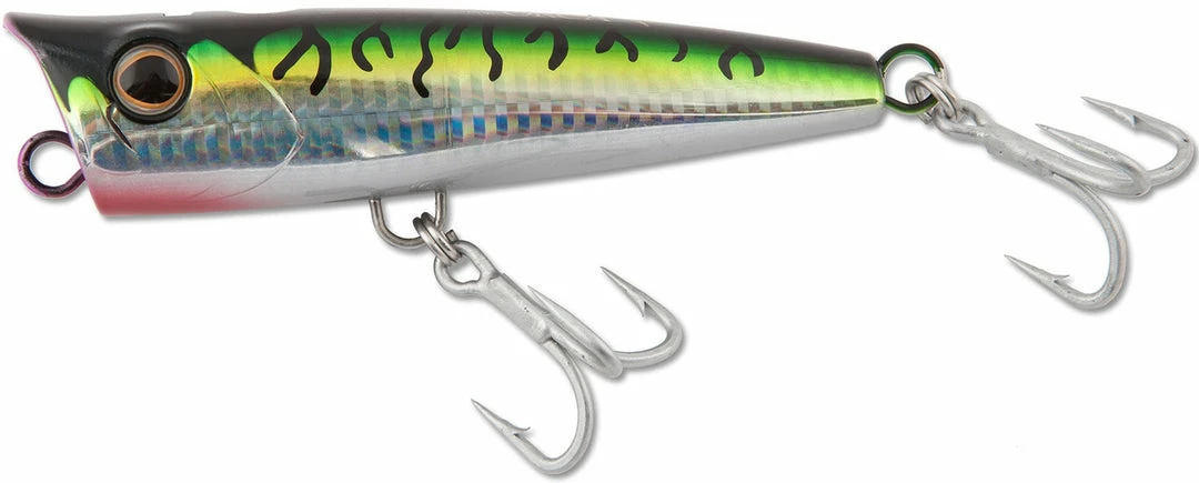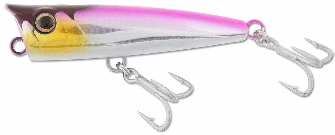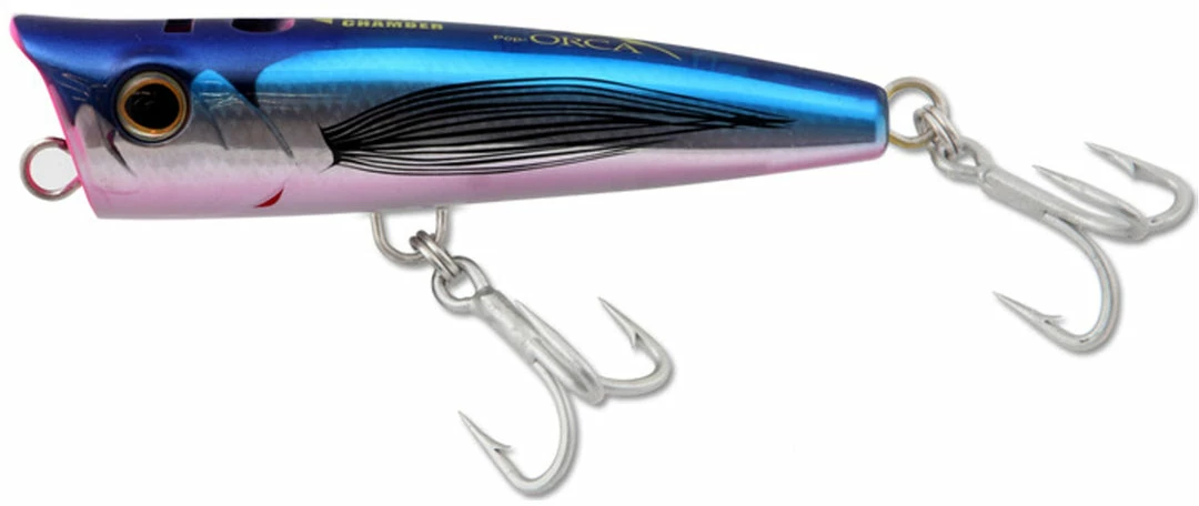 The Shimano Orca Popper is a saltwater-grade topwater popper. It features a unique “Bubble Chamber” open mouth design based on how a jet engine turns low pressure into high pressure. The “Bubble Chamber” will force water through the chamber and shoot it out of the top creating more commotion than conventional poppers, while swimming beneath the surface the lure will leave an enticing bubble trail causing fish to strike. This unique design makes the Pop Orca much easier to work than conventional poppers. With through-wire construction and high tensile strength hooks this lure will take the abuse from the large saltwater offshore species it was designed to target. Available in 7 colors and 3 sizes: 3 1/2 inch (treble hooks), 4 3/4 (treble hooks), and 6 inch (inline single hooks).