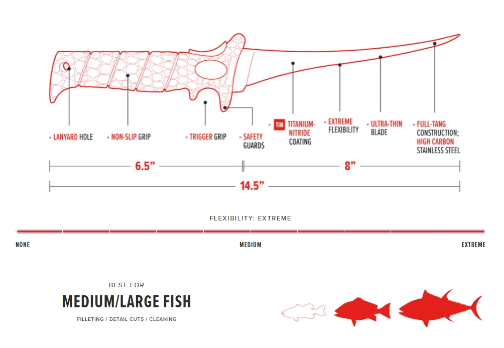 Whether you’re cutting for detail or bone removal, it will be your best friend when breaking down walleye, steelhead, salmon, catfish, mahi-mahi, striped bass, and other similarly-sized species.