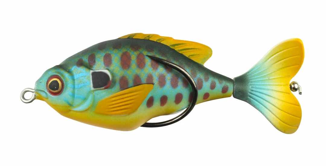 The Lunkerhunt Propfish Sunfish is a unique surface running lure that combines the traits of a hollow body frog and a topwater prop lure. Measuring 3 1/4 inch and weighing in at 1/2 ounce, it has the perfect middle-of-the-road size baitfish profile that matches most forage and can be cast far with ease. Additionally, the prop tail creates a tantalizing wake trail that excites predators while the stout double hook lets it run weedless with ease, coming through slop, wood, pads, and any other cover that gets in its way with ease.