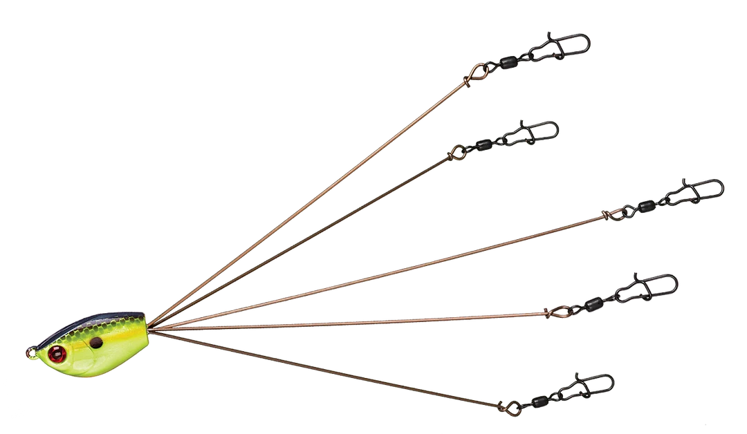 A built-in rattle system is also employed to make it even easier to draw attention from unsuspecting predators. Available in 2 colors great for bass, stripers, and other gamefish, this rig is sure to perfectly mimic a school of baitfish and bring you multiple strikes in no time.